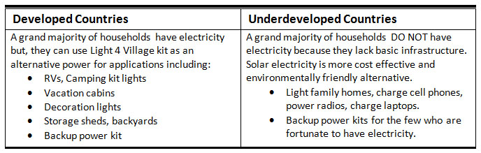 For example, the system is being use in Rwanda and Kenya and it has proved to work. For example, a 20 Watt solar panel can run one light bulb for 24/7 with 5 hours of sunlight per day. Three bulbs will run 8 hours while 6 bulbs will run 4 hours. The Light for Village does not required house wiring, a huge cost saving. The battery bank may need to be replaced in 4-6 years. Light bulbs may last 5+ years or 30,000 hours. Solar panel: 20+ years.